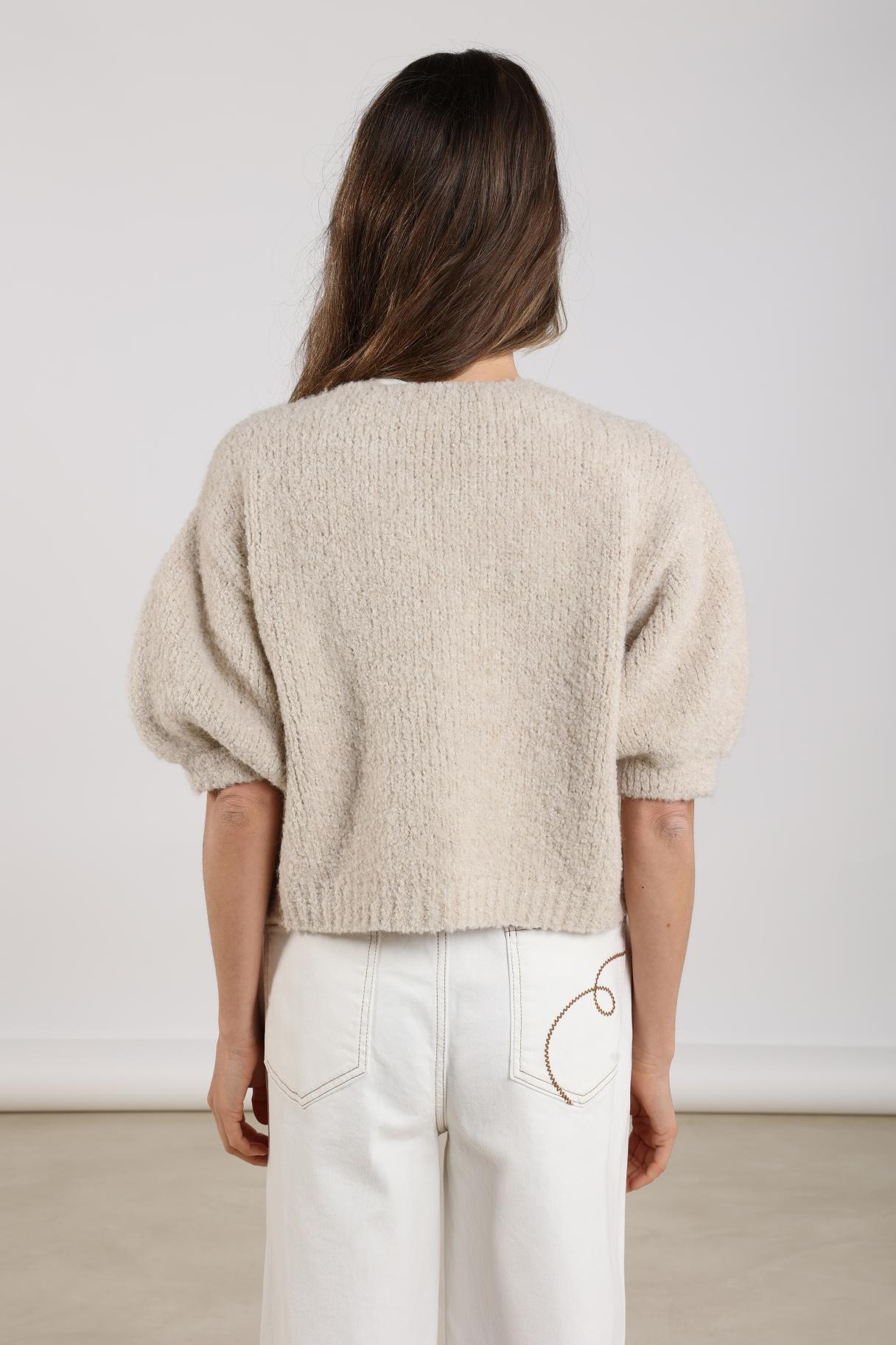 Jip cardigan van Nukus in de kleur beige. Het zachte wollen vest heeft een lossere pasvorm en driekwartmouwen en is verfijnd met een glanzende lurexdraad.