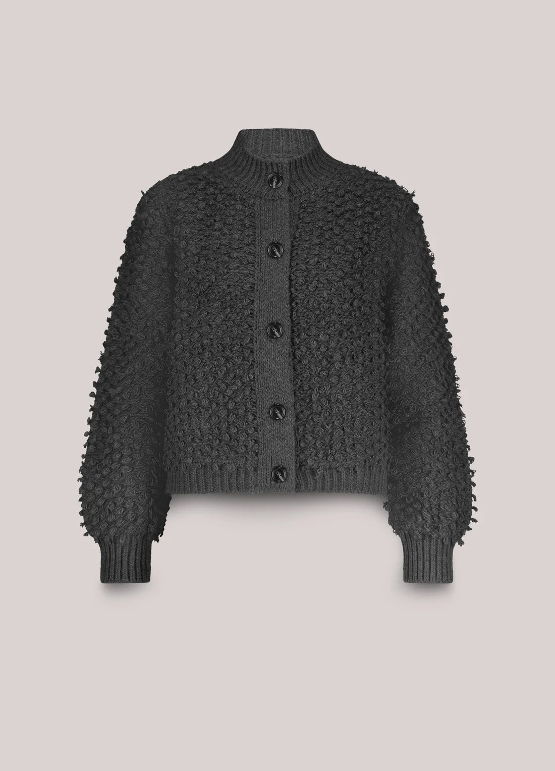 Antracietgrijsgebreid vest in een lussensteek van Summum. Het model heeft een ronde hals en sluit met grote knopen.