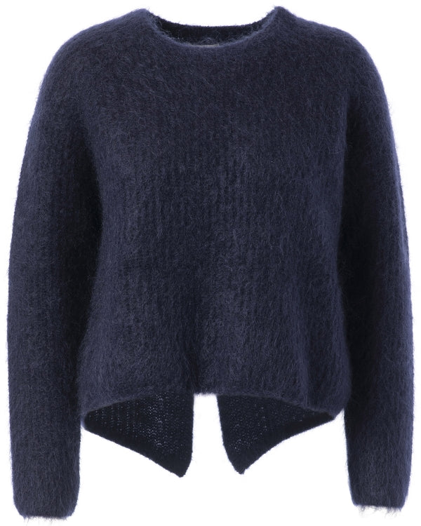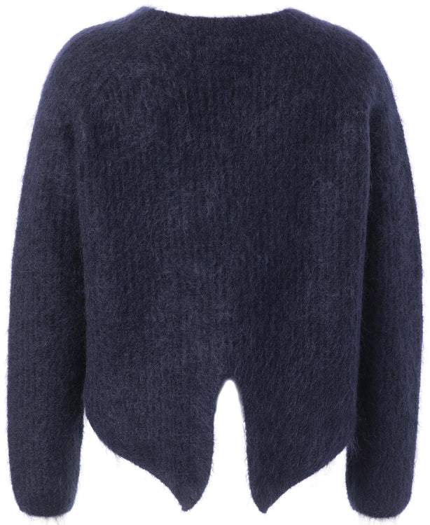 Donkerblauwe Keaton trui van JcSophie. De trui heeft splitjes aan de achterkant en is gemaakt van: